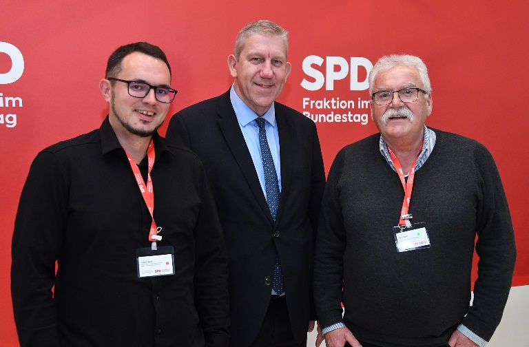 Patrick Weiß (links), Personalrat an der Uni Bamberg, und Hans Wolff (rechts) von der Arbeitsgemeinschaft für Arbeit der SPD Bamberg haben diese Woche in Berlin auf Einladung des Bundestagsabgeordneten Andreas Schwarz bei der Betriebsrätekonferenz der SPD-Bundestagsfraktion beim Thema „Künstliche Intelligenz in der Arbeitswelt“ mitdiskutiert.